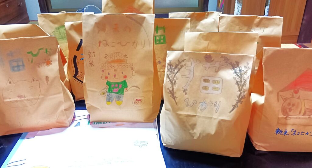 子どもたちにデザインしてもらった米袋も完成し、袋詰めも済ませたので、イベントの参加者に配っていこうと思います。もうしばらくお待ちくださいね!!